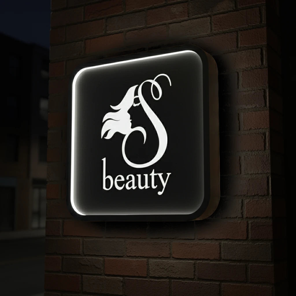 Châssis en acier galvanisé, peinture thermostatique. Couleur personnalisable. Face avant ajourée selon votre logo. Rebord intérieur de 8 mm en plexiglas blanc. Disponible en plusieurs dimensions. Option Relief : plexiglas de 8 mm appliqué sur le logo.